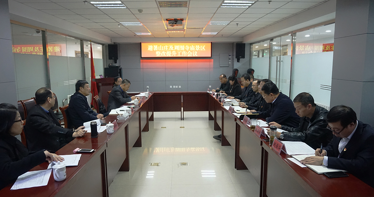會上,市政府副市長崔萬峰同志聽取了市旅游和文化廣電局調研員李金龍同志就避暑山莊及周圍寺廟景區整改提升工作情況的介紹和市國控集團下屬智能停車場公司執行董事胡杰同志就整體工作中涉及該公司管理的景區周邊停車場的整改提升工作進展情況的介紹。