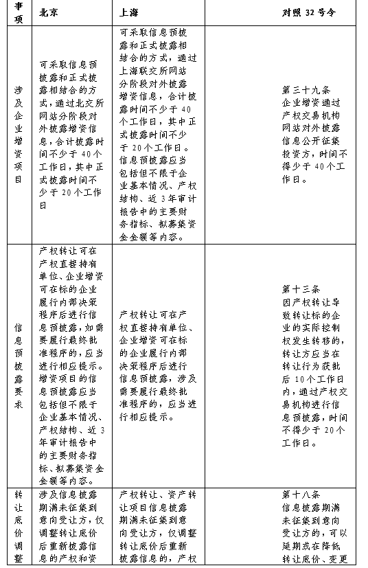 六、企業(yè)增資可采取信息預(yù)披露和正式披露相結(jié)合的方式,通過產(chǎn)權(quán)交易機構(gòu)網(wǎng)站分階段對外披露增資信息,合計披露時間不少于40個工作日,其中正式披露時間不少于20個工作日。信息預(yù)披露應(yīng)當包括但不限于企業(yè)基本情況、產(chǎn)權(quán)結(jié)構(gòu)、近3年審計報告中的主要財務(wù)指標、擬募集資金金額等內(nèi)容。七、產(chǎn)權(quán)轉(zhuǎn)讓可在產(chǎn)權(quán)直接持有單位、企業(yè)增資可在標的企業(yè)履行內(nèi)部決策程序后進行信息披露,涉及需要履行最終批準程序的,應(yīng)當進行相應(yīng)提示。(與32號文相應(yīng)規(guī)定相比,將增資行為作為法定信息披露的內(nèi)容)