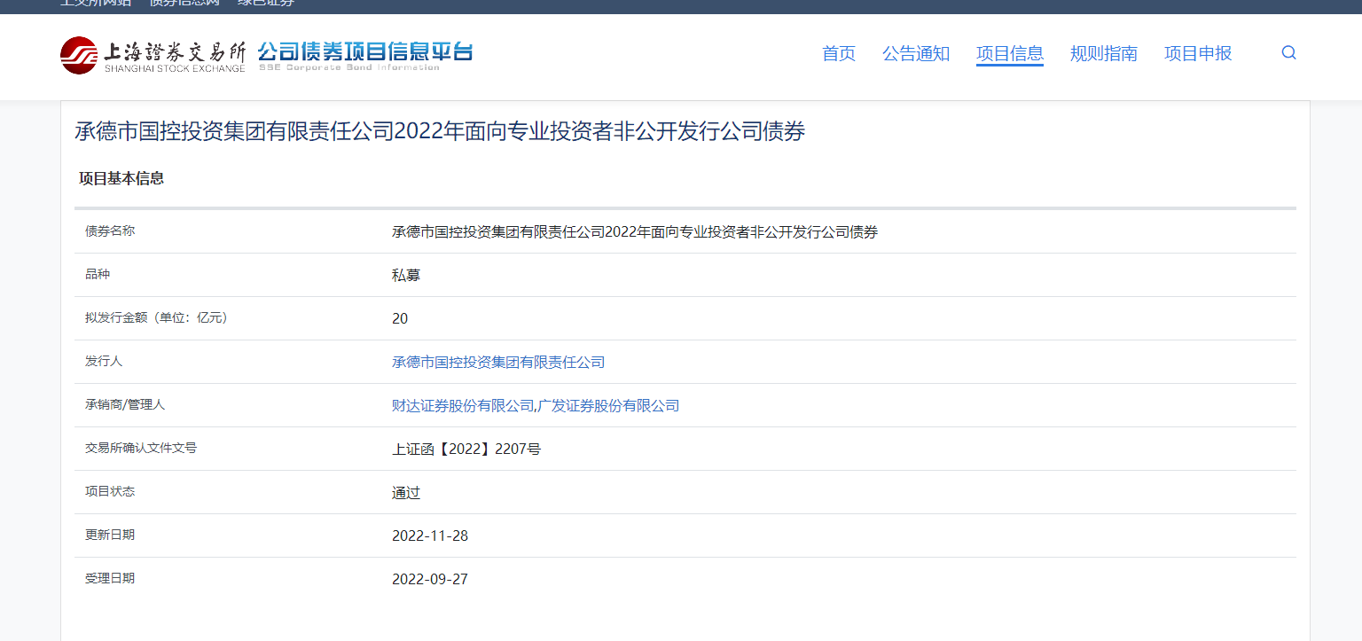 11月29日,集團公司收到上交所《關于對承德市國控投資集團有限責任公司非公司發行公司債券掛牌轉讓無異議的函》,同意市國控集團非公開發行20億元公司債券,專項用于償還“20承控01”公司債券等到期債務。